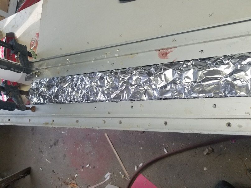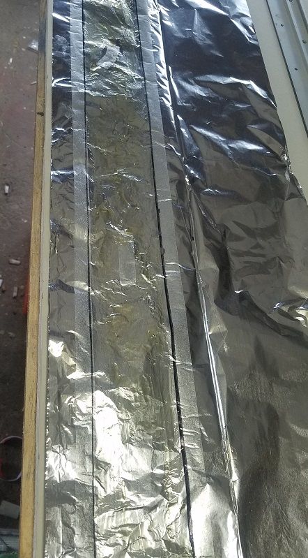 Using heavy duty aluminum foil, I apply a thin layer of polyurethane gorilla glue inside the black lines shown above. Using a spray bottle, I misted the glue with water which acts as a catalyst for the glue. I added double stick tape to seal up the glue. The idea here, once cured the glue will harden my rock face template. I folded the top piece over then crumpled up the foil. Next lay it out shown below: