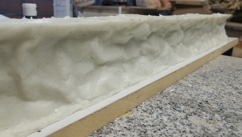 OK, more prototyping. I decided to make a rock face mold using silicone caulk purchased at a Dollar store (Red Devil brand). While searching for techniques using caulk reminded me of an old engineering saying: "The wonderful thing about standards is there is so many to choose from". I found so many methods and tried a few which didn't work of course (didn't try the Dawn soap one).