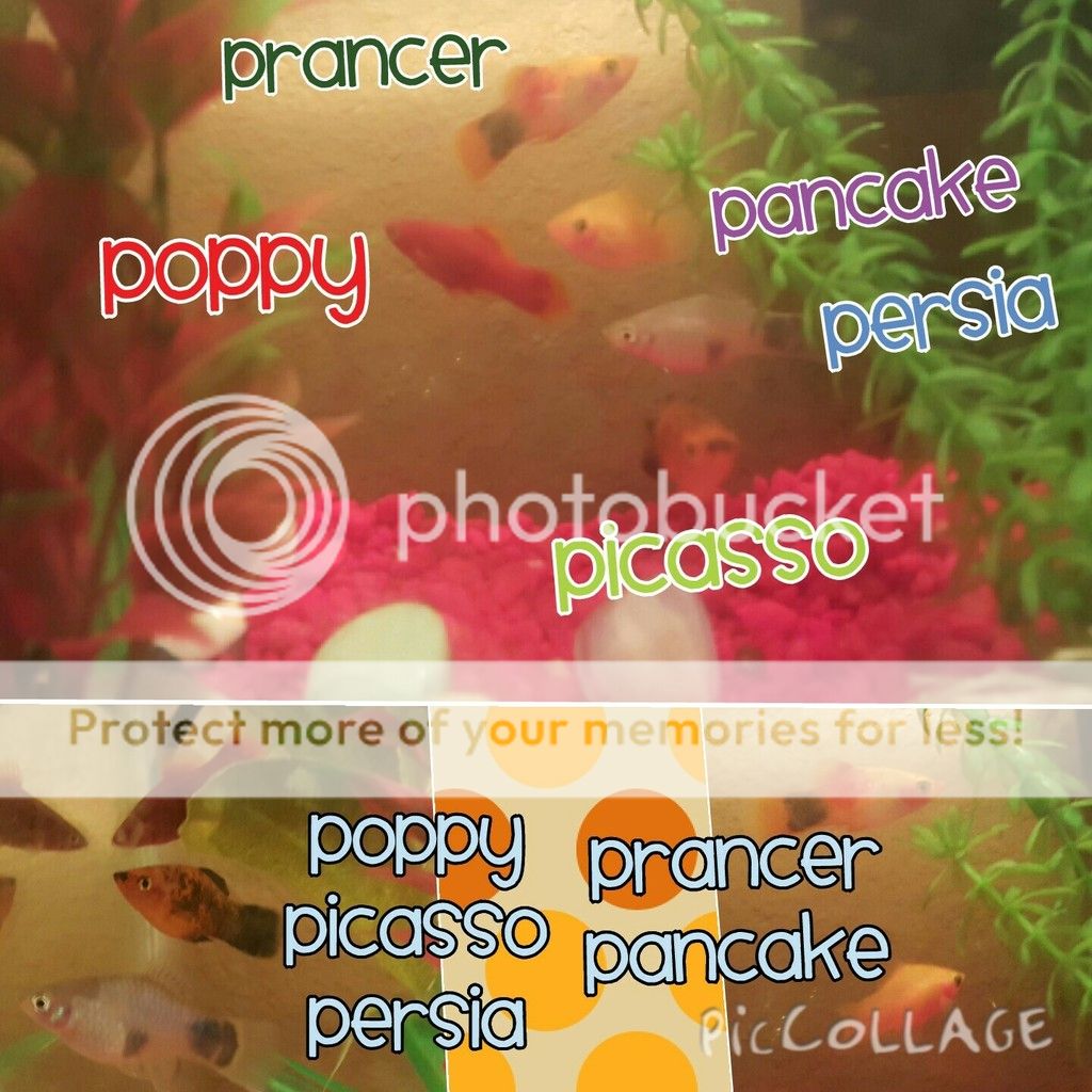 These guys are hanging out in quarantine until they get a clean bill of health. The algae on the tank isn't allow me to take the clearest photos. Large mickey mouse platy is Prancer, solid red is Poppy, blue platy is Persia, yellow platy with pink cheeks (awe Pancake) and a spotted platy with a black mustache named Picasso.