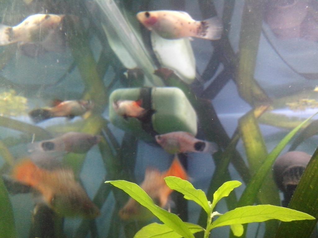 These guys are hanging out in quarantine until they get a clean bill of health. The algae on the tank isn't allow me to take the clearest photos. Large mickey mouse platy is Prancer, solid red is Poppy, blue platy is Persia, yellow platy with pink cheeks (awe Pancake) and a spotted platy with a black mustache named Picasso.
