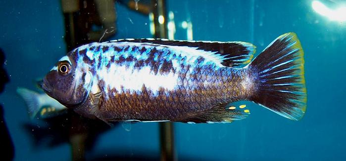 Here is one of my male pseudotropheus msobo....sorry about the glass....I have been pulling fish out of this tank left and right...also all of the rocks...so the glass is a bit yuck, or WAS.