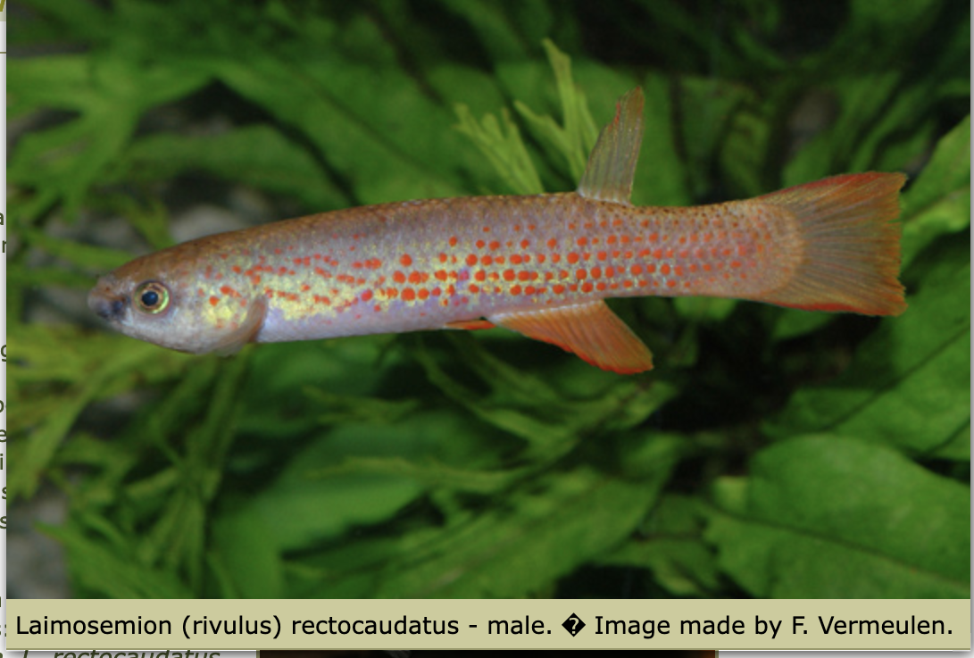 The common names for Laimosemion Rectocaudatus?It's a 'rivulus'-- Laimosemion rectocaudatus. Formerly known as Rivulus rectocaudatus before the revision of Rivulus. There are several stunning Laimosemion, all small jewels.