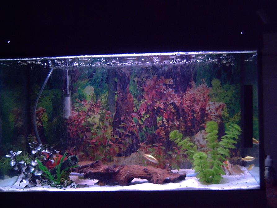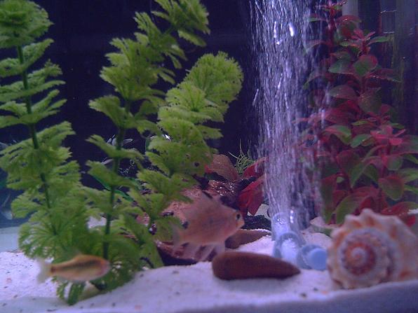 I've had the tank for a while, they are all still relatively young, although they have grown quite a bit since i took them home from the LFS The ram seems to really be enjoying the new sand though dont worry about the cheesy bg, im going to take it off and just put a plain black or something on it.
