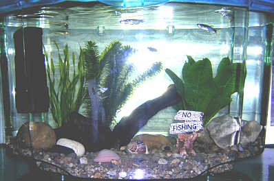 My filter has a very strong current and my guys love to skim it at the top right hand side where its at its strongest, its like they are having a race...lol, or when i come into the kitchen they all crowd around there waiting for me to feed them, they are so funny. When the evening draws near they quieten down and like to surf the gentle current towards the back next to plant on the right hand side, its like they go into some sort of "trance" and just stay still in one place and gently surf its interesting to watch.... there are many places to hide and settle at the bottom like under the filter or towards the back left or middle, or round the rock on the right and well they love to play chase especially the "tail nipping game", there is plenty of room to scoot around (seriously) they are very fast active and humurous to watch.