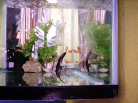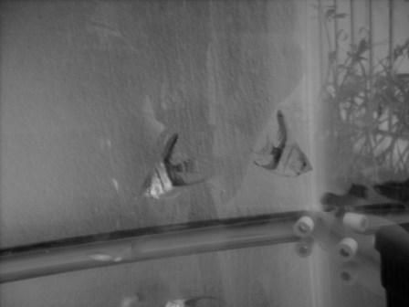 de first pic was taken in de night and the colour quality was very poor, so i did a black and white version while the second pic showed my two angel in a corner of my 40 gall tank..