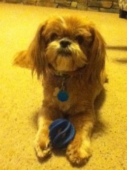 My dogs name is Chewbacka Coco Puff, coco for short. he is seven years old and is a purebred shih tzu. He is light brown with a white beard. He sleeps on the foot of my bed almost every night. He follows me around the house and always wants to be pet. He can sit, lay down, play fetch, dance, and sort of stays and comes when told. We are working on doing a hand shake. People say you can't teach old dogs new tricks, he was 6 when he learned to dance and lay down on command. Along with vocal training I have also incorporated hand signals with the vocals. So if we have guests over I don't have to say anything and interrupt.