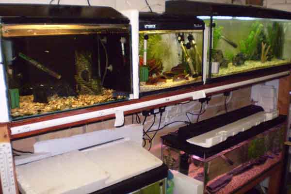The dalmation molly parents are kept in the middle tank in the top picture. Their offspring then get transferred to the left tank. When they are larger and ready for selling they go to the far right.