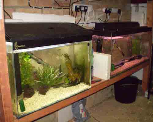 In the lower picture my endler parents live in the left tank and their young are moved to the tank on the right 2 weeks after birth. When they are big enough for selling they move upstairs with the dalmations.!