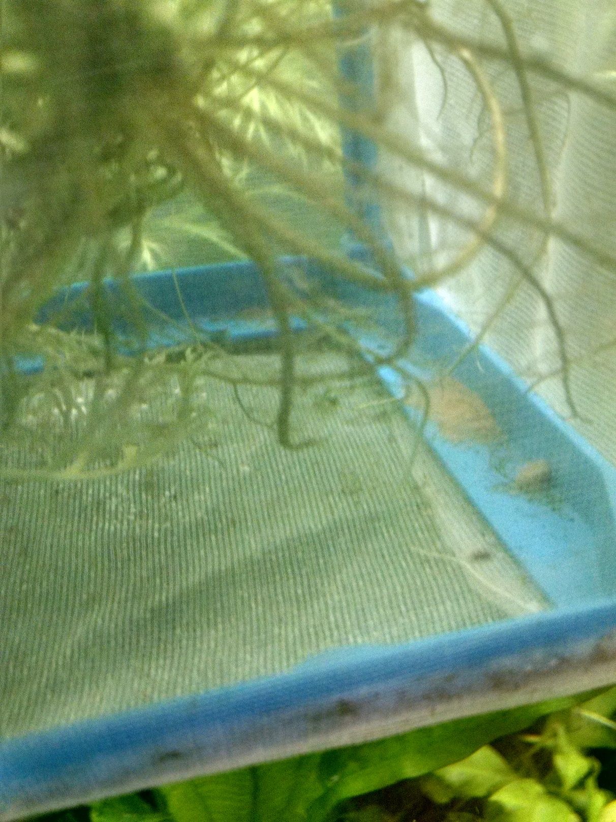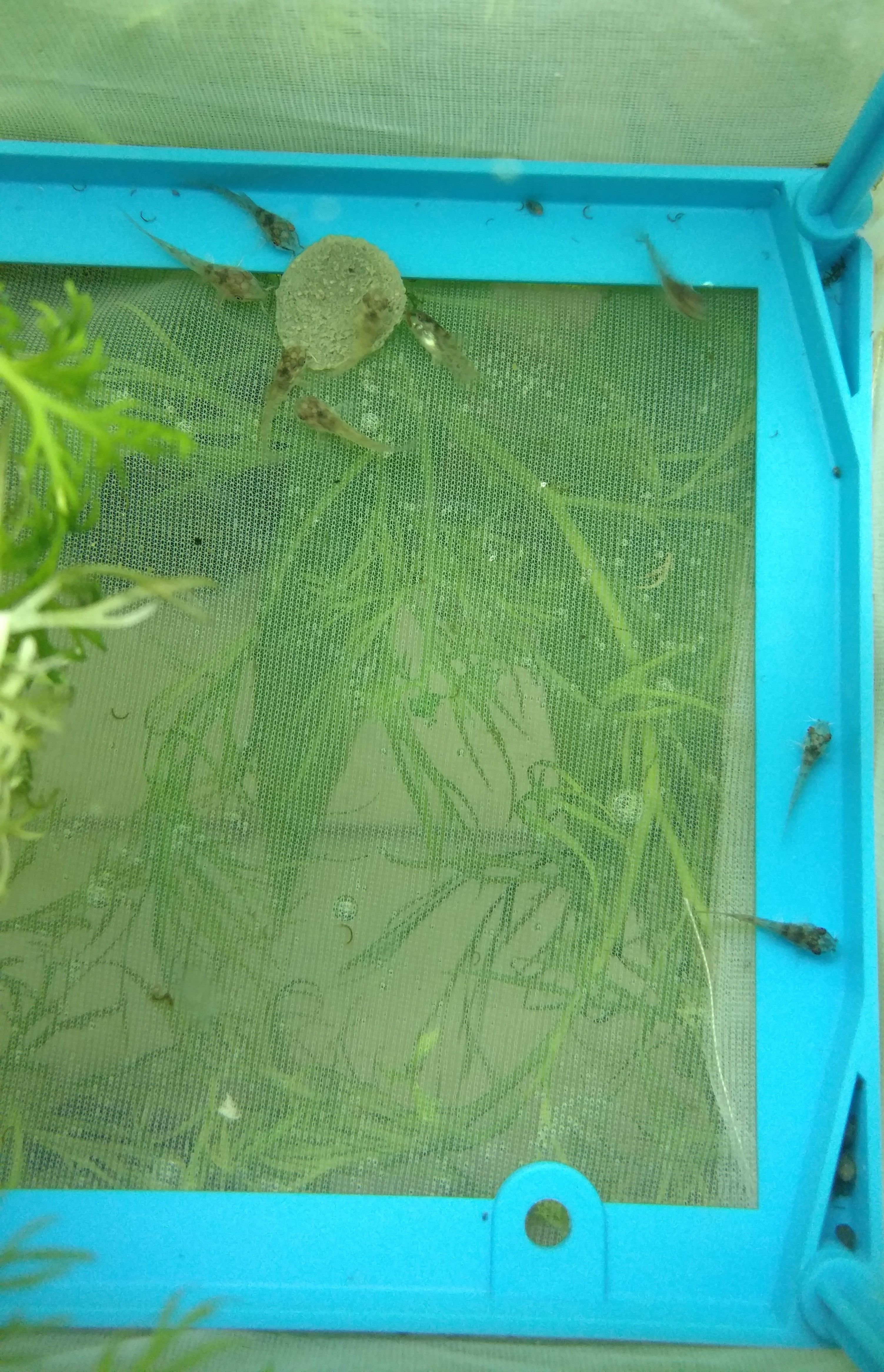 Here's a picture of the inside of the net with the cories in it. They are a little older here. I don't actually try to breed these guys. They just volunteered themselves by getting sucked up into the filter and waiting for some sucker (me) to find them and coddle them. I pulled 11 out of the filter the most recent time (that's when I decided that enough was enough and I put a sponge over the intake tube). At any rate, this view is from directly above the box. You can see the fine mesh as well. I like the net breeder overall. I got mine on Amazon if you are thinking about getting one, but I'm sure pet stores would have them too.