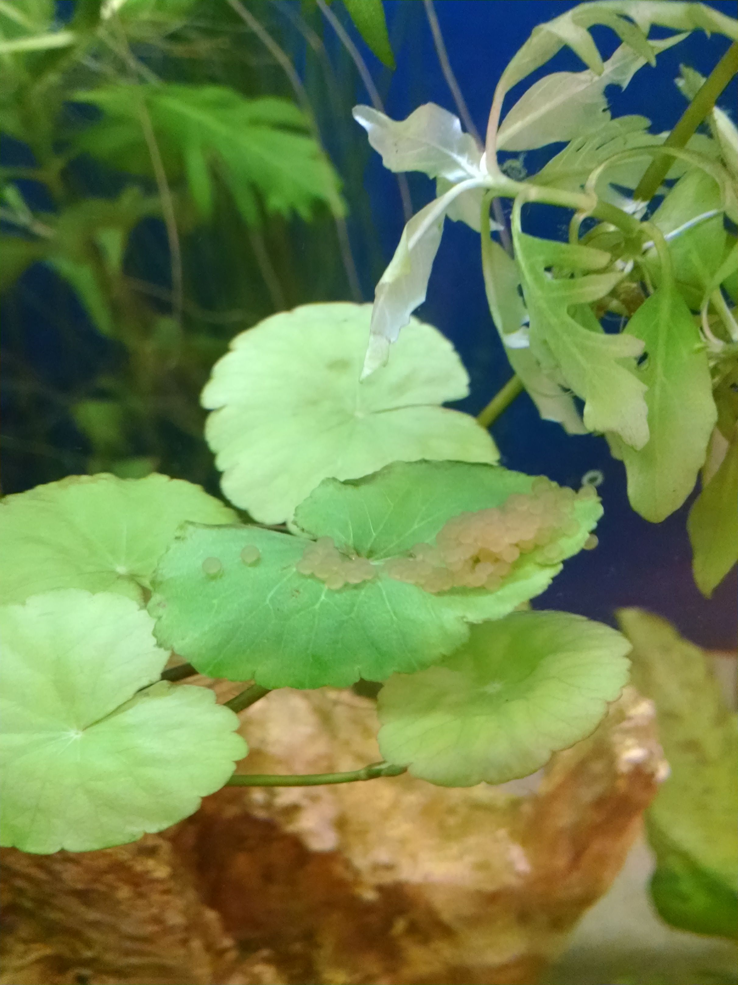 Here is a picture of cory eggs after they have turned that off-white color I told you about. If you see any eggs this color, grab those and put them in a net breeder and see how they do. The eggs below were eaten within a couple of days (I mean, come on, they even look like they're on a little plate!) but this is the "fertile egg" color. If you never see any get this color, you may not have any males or they may be getting eaten before they can become viable. Best of luck to you!!!