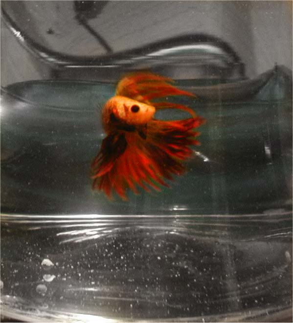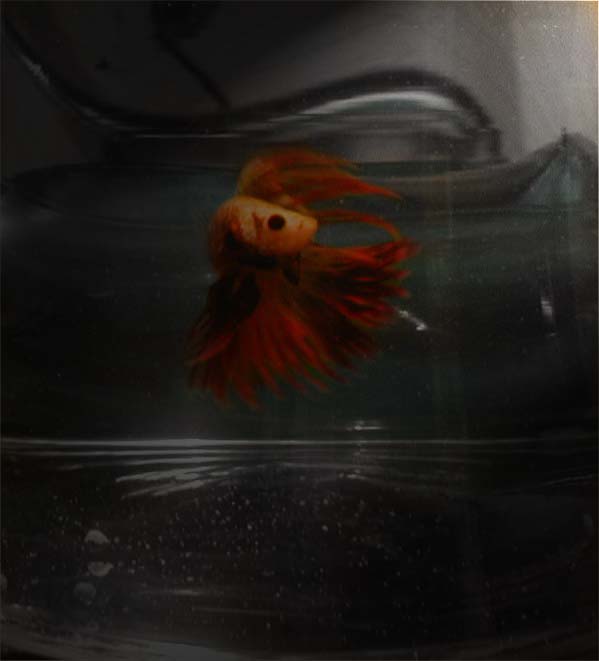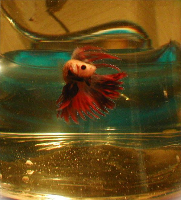 You can see a bit of a blue halo around the fish, but I think this picture makes the betta look better. Unfortunately, photoshop won't clean that junk off of the bottom of your tank. What I tried to do is remove the effect of the junk on the glass and the beams of light on your fish, which was a bit sucessful.
