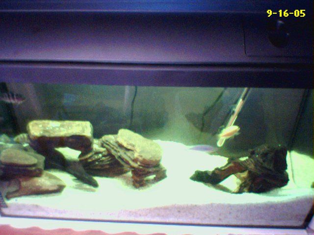 Here is a picture of my first go at setting up an african tank. Im gonna tell you, that rock work was alot harder than I thought it would be.. took me two hours to come up with what I did. Im sure it could use more rock but thats all I had picked and cleaned. I still have to get a background too. I wasnt satisfied with the one I had. Im thinking maybe a black or blue one. MY yellow labs will be here tomorrow!