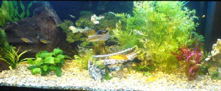 I like your tank very much. You have laid it out with great artistry - the rocks look comfortable where you have put them and the variety and positioning of the plants seems natural - most welcoming to any fishes.
