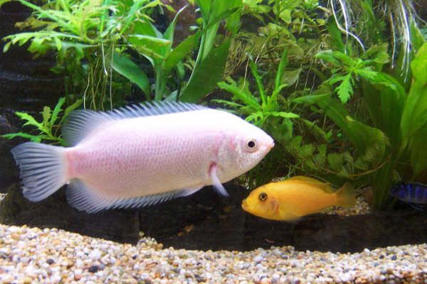 four foot by two by one feet. malawi setup with a clown loach and very large kissing gourami.