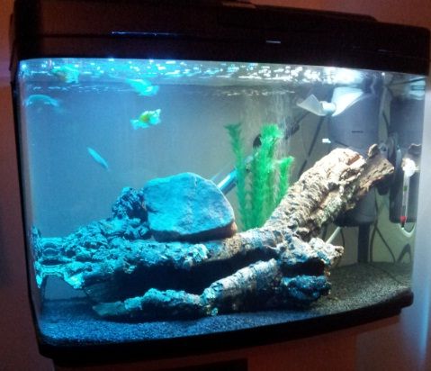 I have a 64l (2ft) tank (about 62l with ornaments in) the rock is a temporary measure to keep the log sunk.