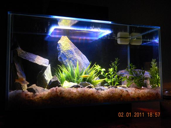 Just a few pics of my fluval edge did an led upgrade for at night! houses a sword tail a betta 2 glofish a cory cat and and algae eater!