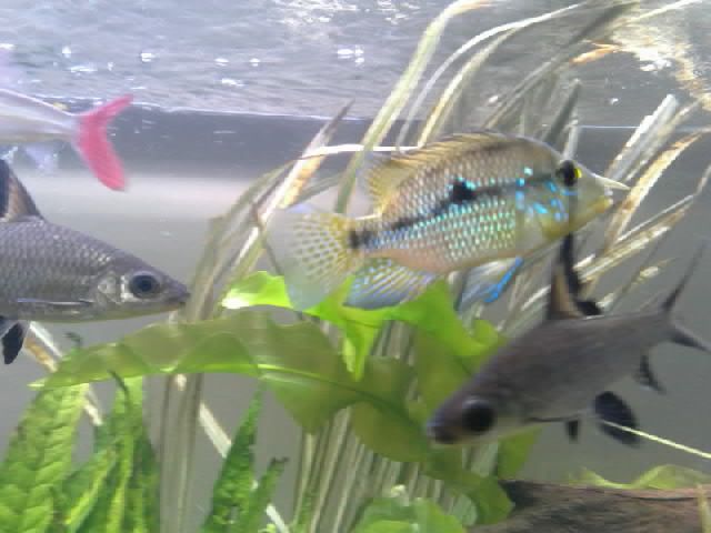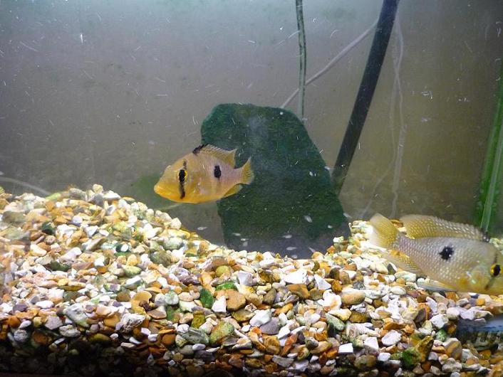 hi i have 2 geophagus brasiliensis, very similar to your geos but with metallic blue specs. Just wondering if you know how to sex them? Yours look the same with 1 with slightly darker/brighter colouring than the other, im taking it this is the male 1? Mine are similar 1 being brighter coloured than the other but 1 is forever chasing the other, so im thinking both are males, the brighter 1 being the most dominant. I could get a couple more in hope 2 pair off, but would help greatly if i could get a definate difference in the sexes.