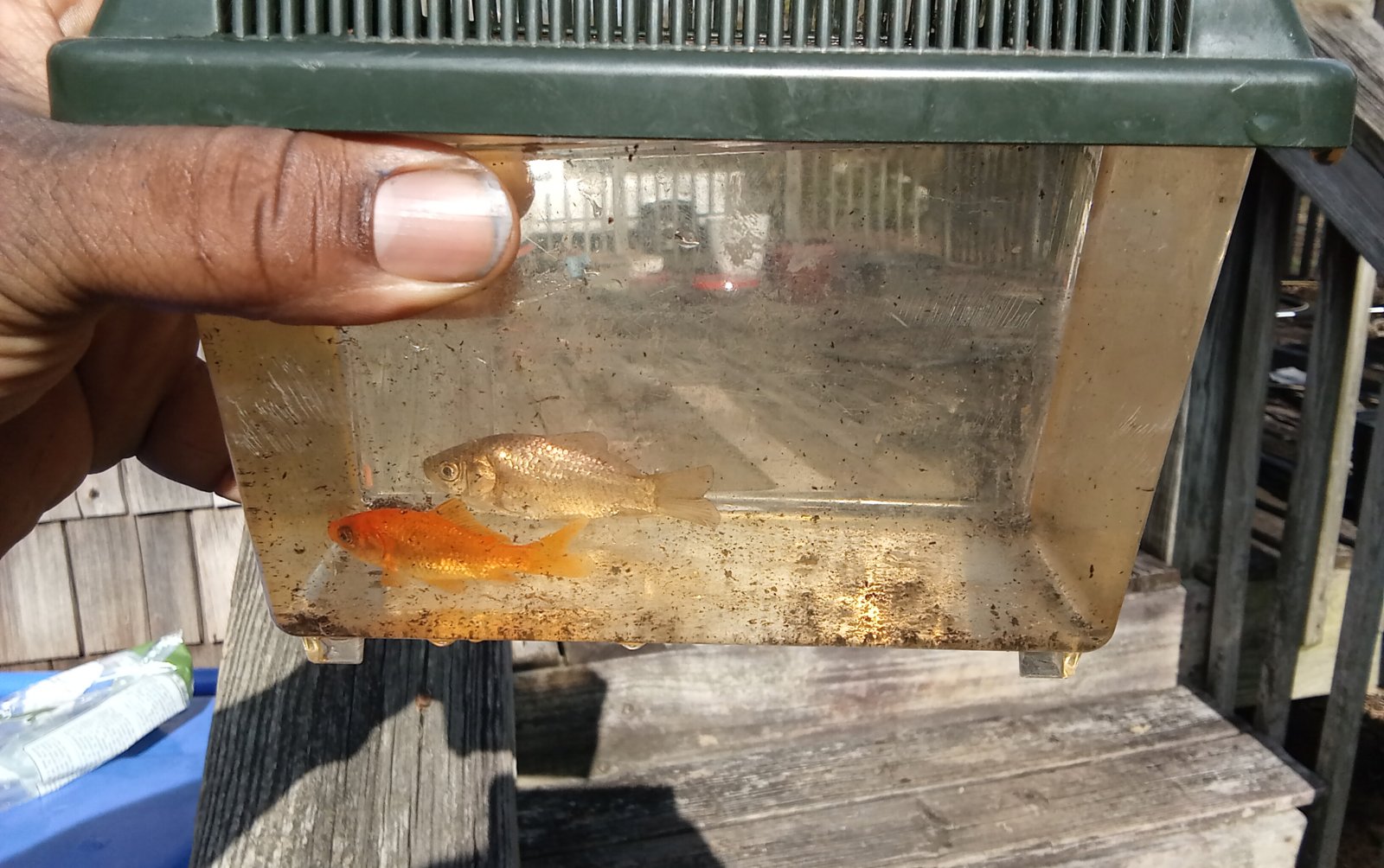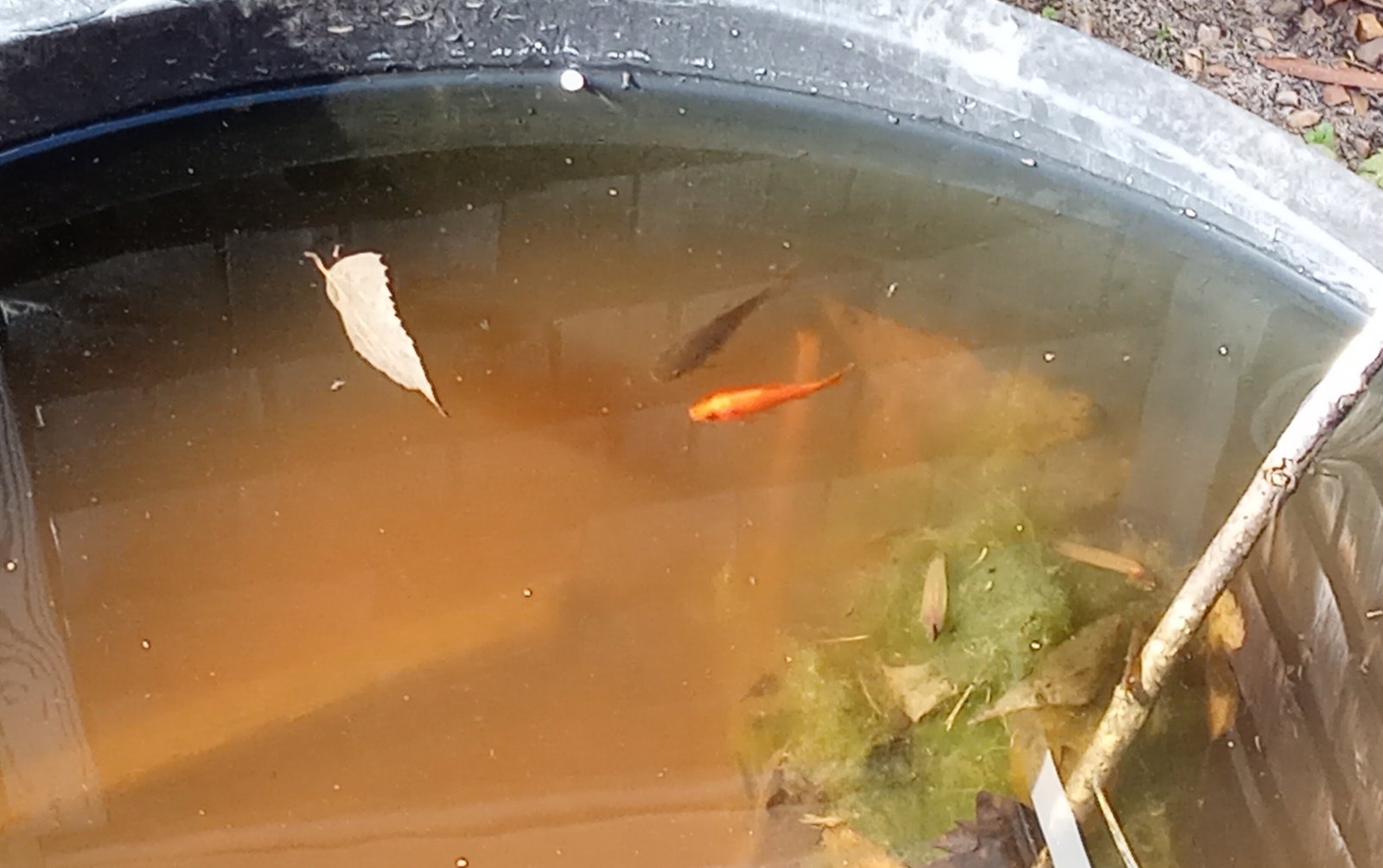 I lost my Sailfin Mollies back in the winter, and didn't have the patience to wait for more. So I went and got two goldfish for my second tub. The brown one's name is Raine. Would someone like to help me with a unisex name for the smaller orange goldie?(And no, I will not name them Goldie!)