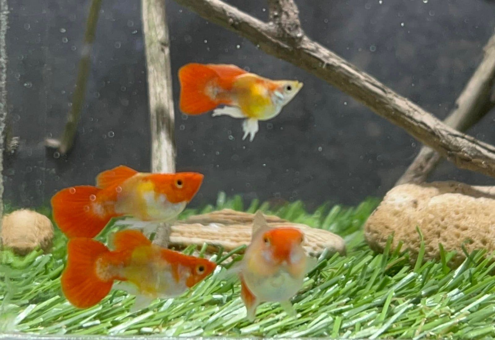 I've been keeping guppies for about a year and a half now. I bought 4 male guppies - one of them (Zebedee) grew much faster and larger than the others and with a larger belly that we thought it might be female, and recently the other three boys have been paying it a lot of attention. It spends most of its time hiding under the rock or in the corner, and one other guppy (Gus) likes to nip its stomach.