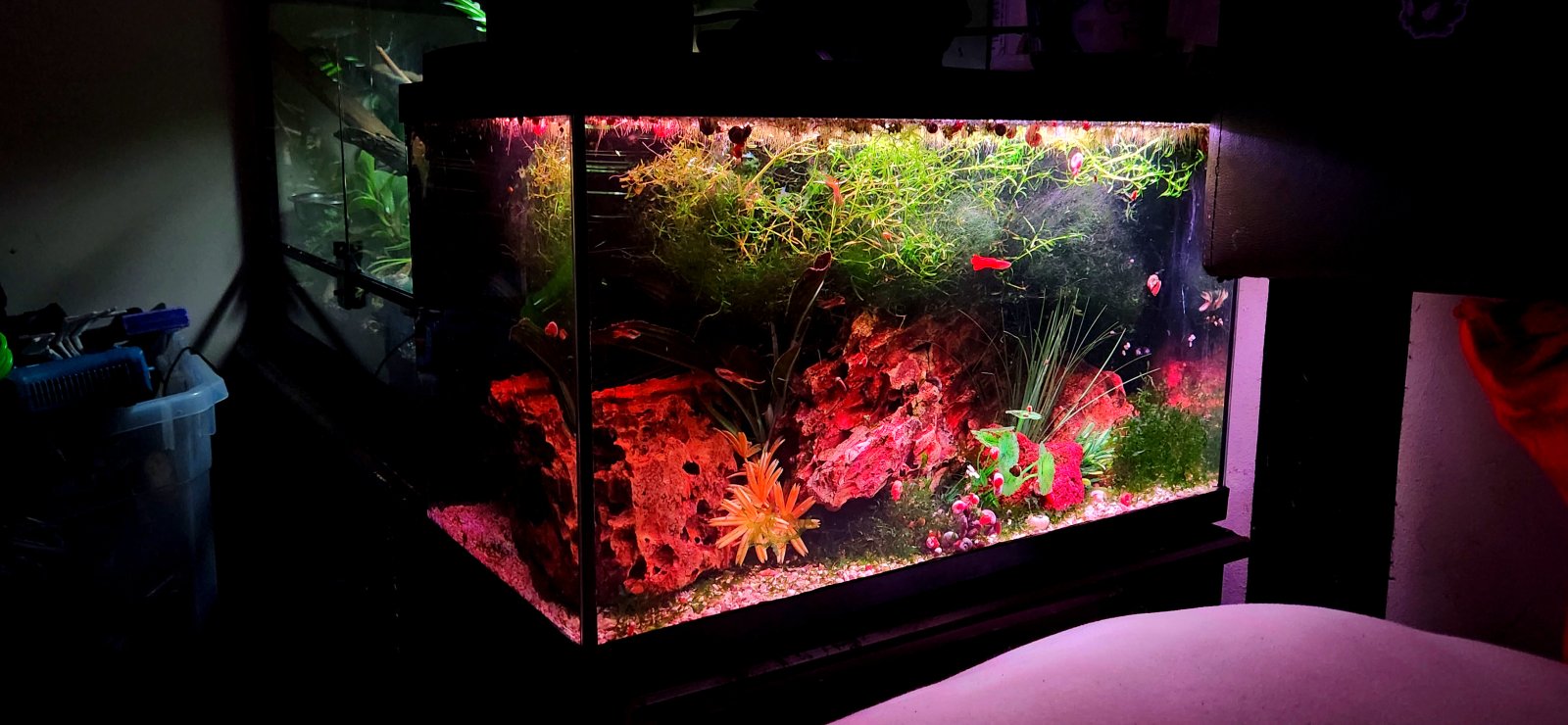 Kid's endler tank. Home to 8 male endlers (well, one of those eight is a guppy-endler hybrid). Can't get a frontal photo anymore because of room location. The bed is in the way lol it's beside his bed so he can watch his fish at bed time.
