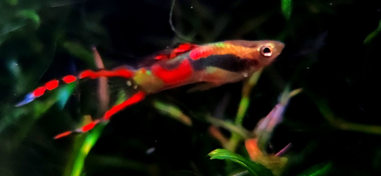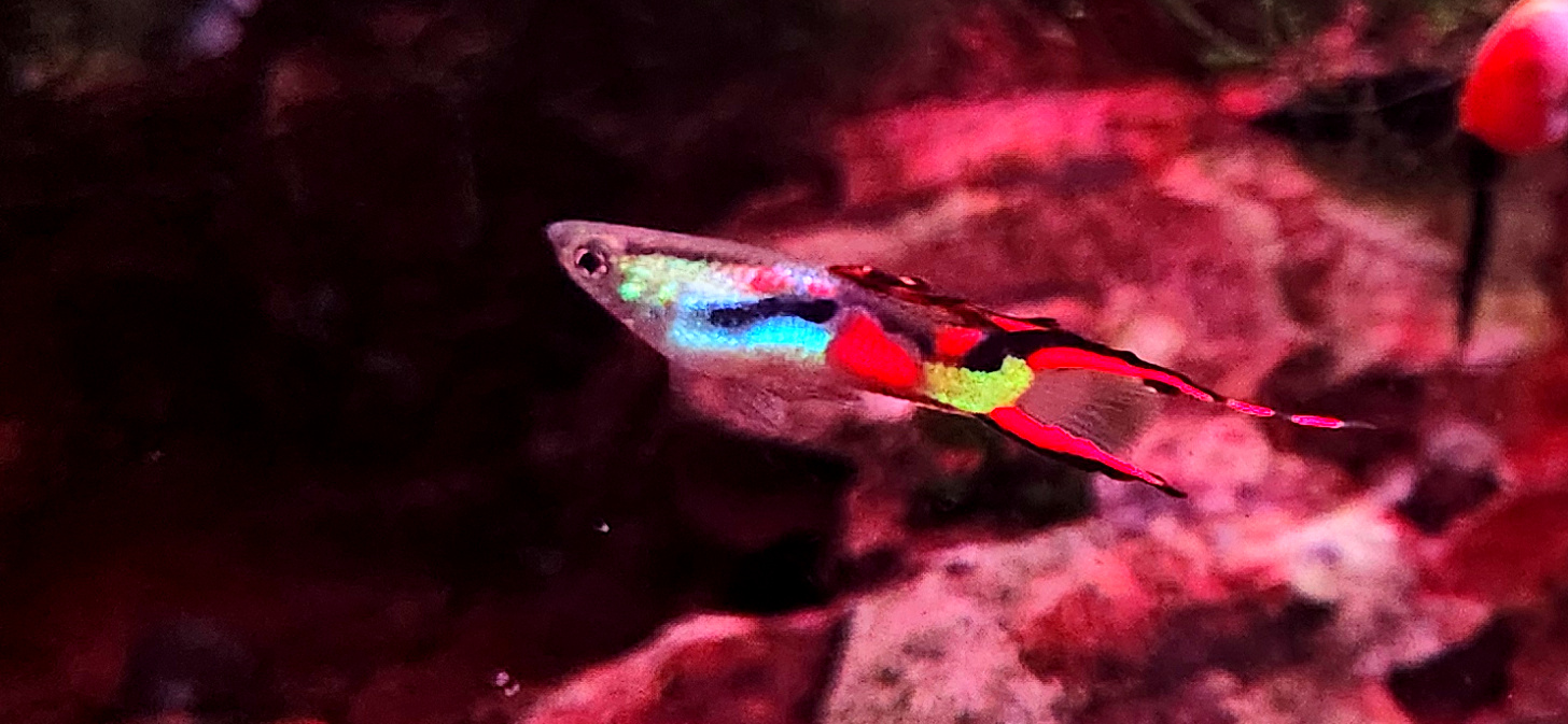This is the hybrid boy, courtesy of a local friend who bred a black bar endler male with an albino koi female guppy. His black bar shows sometimes and other times he doesn't show it.