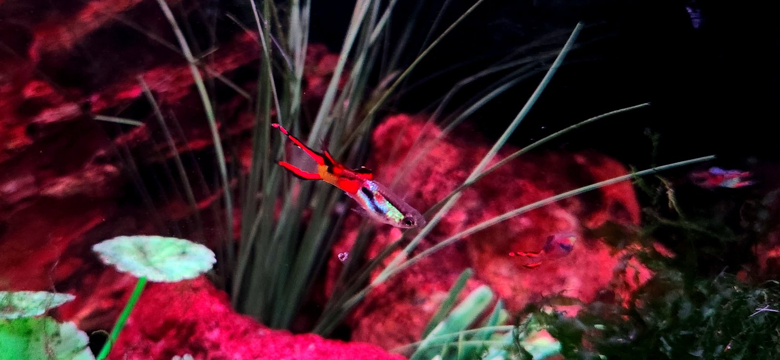 I had to replace the light it had, the new one is a JC&P submersible bar light, it's fairly bright but I also can't adjust the white balance so it comes out more red toned... which makes the red on his endler boys POP.
