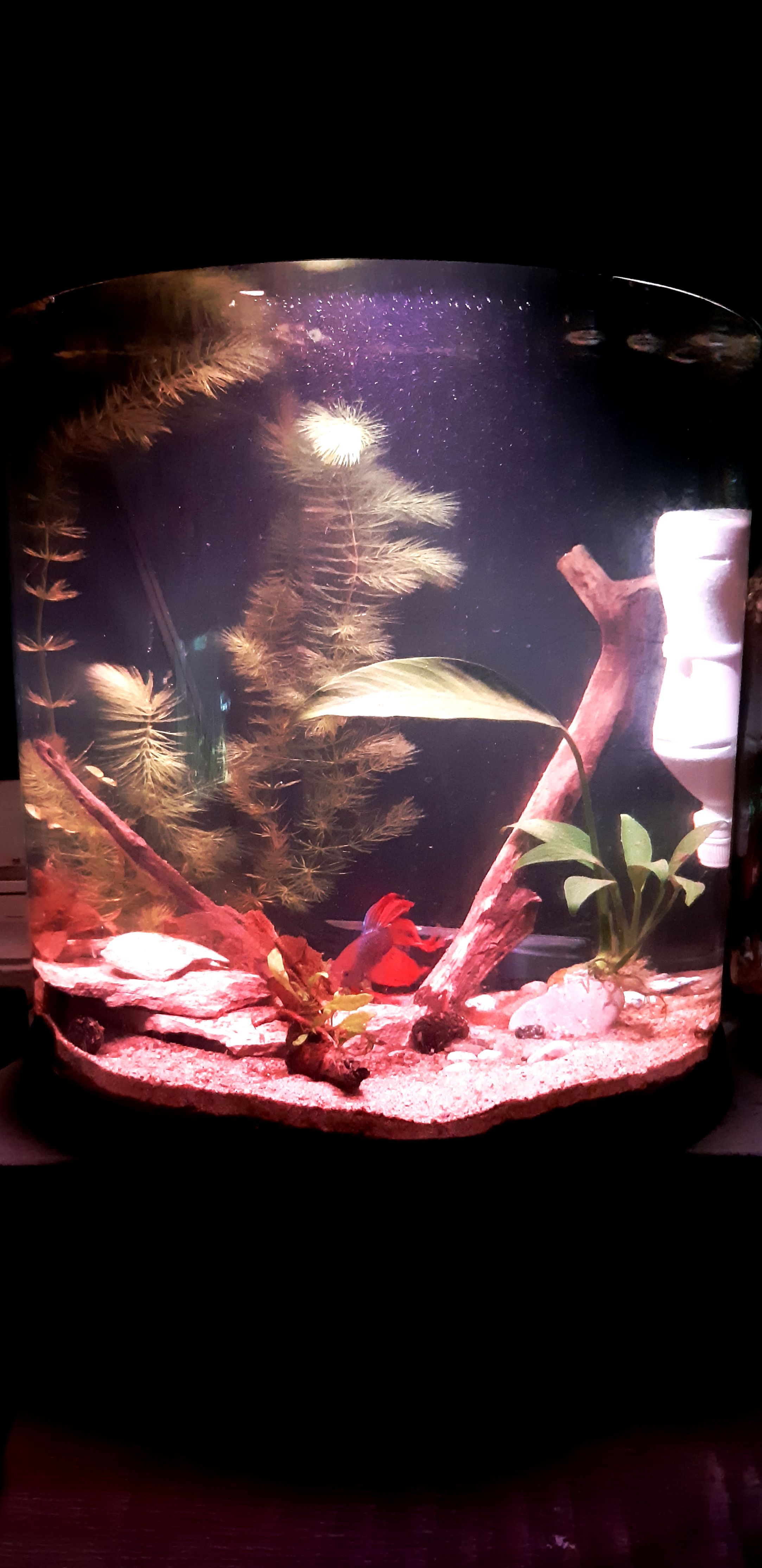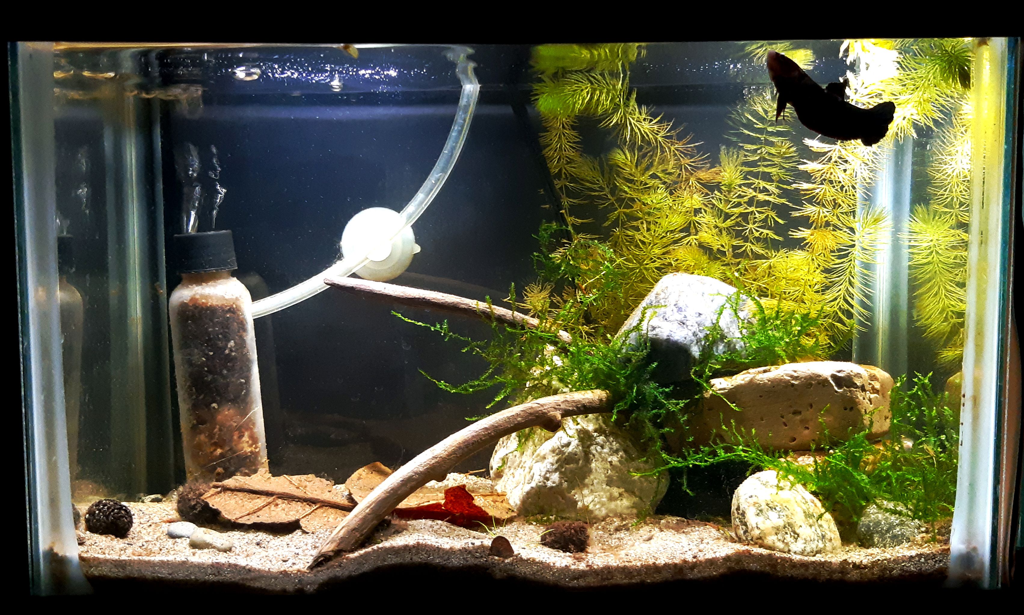 My male betta's tank got a redo. Took out the filter he had in it that came with the tank, replaced it with a DIY air powered bottle filter. Opened up more swim space. Took out the blue rock too.