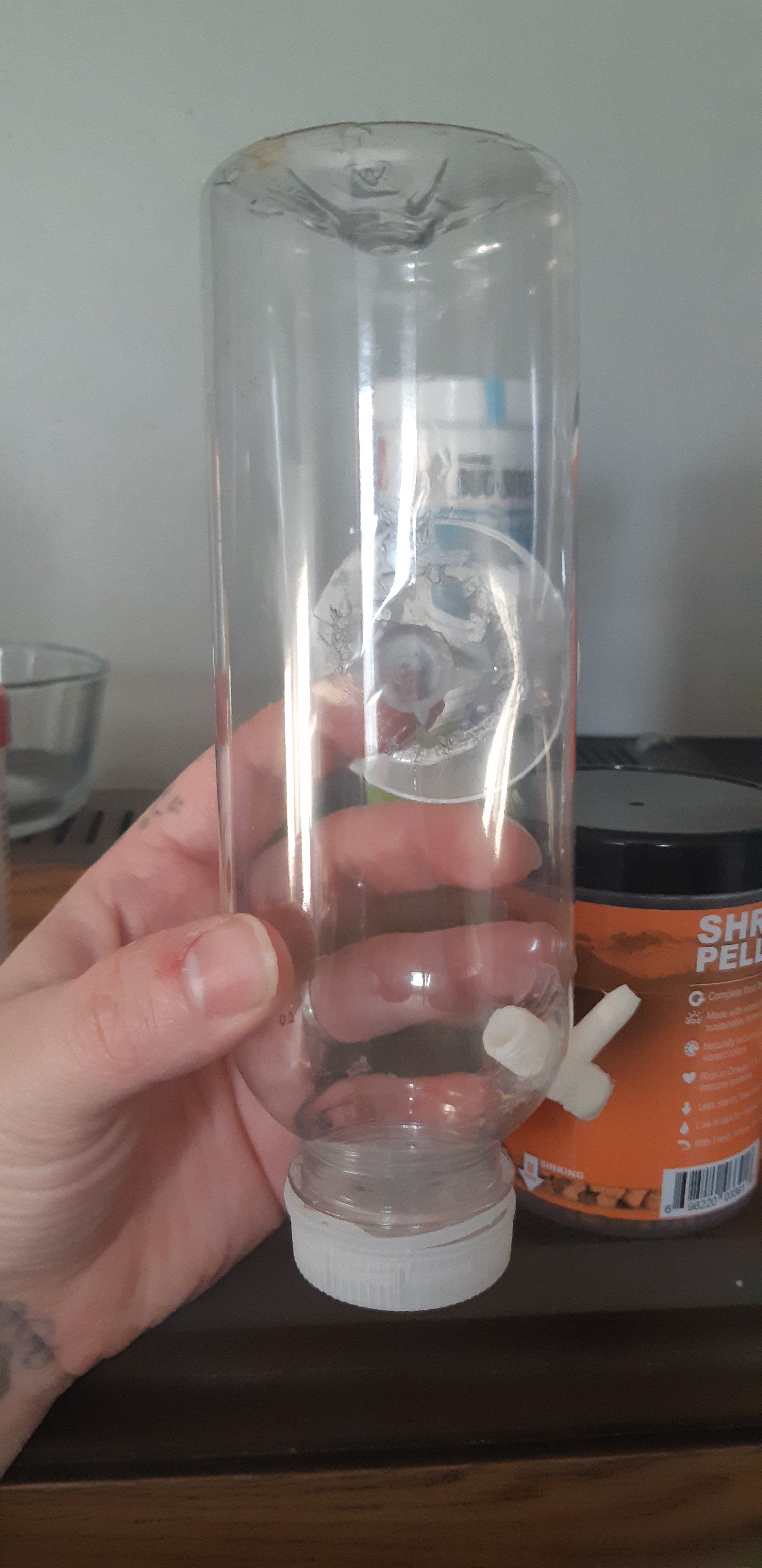 Holes drilled in the bottom to suck water in, airline attached at the side, holes drilled in the top to let air and water out. Inside will be filled with sponge and biomedia. Fully customizable as long as you can get it inside the bottle lol. You can cap the bottom of the bottle with sponge as well for even more biological filtration if you wish too.