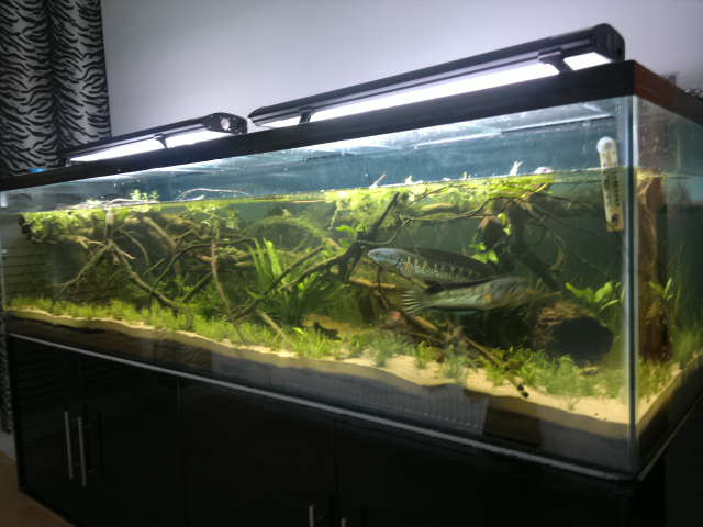 this is my new set up with hand made cabinet base using ikea high gloss black draws.my tank is specially set up for the snake heads so its sub tropical with no heater but has under gravel heated cable for the plant nutriants temp is 22 degrees,