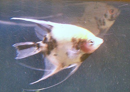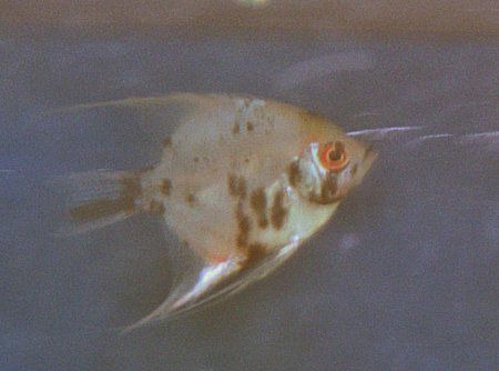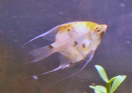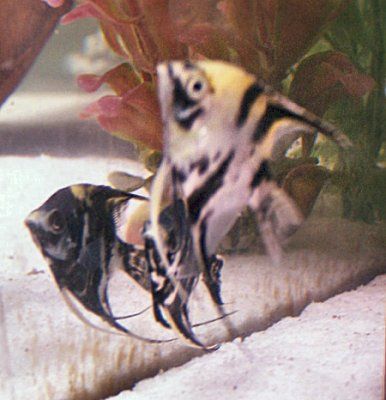 After several fiascos of trying unsuitable tankmates for my rainbowfish I finally sent them all back to the lfs along with the severums and got 6 baby angelfish. I don't know how old they are but they're much smaller than the 2 angels I had before. They're from quarter size to just over silver dollar size and range from nearly black to nearly white, including a blushing koi! At least I think it's a blushing koi, I don't know much about the angelfish color variations