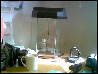 Put everything into it, it looked lovely. Just before we were leaving for the weekend I went to take one last look, put my hands on the desk in front into a puddle of water. There were two cracks in the bottom of the tank. But, I counted my blessings, could you imaging 5 gallons of water on the desk on Monday? eeeeeeeeeek.