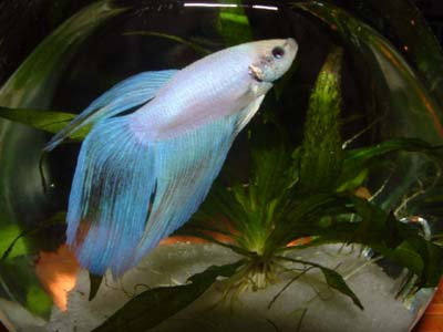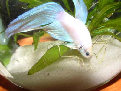 That's a very nice betta. I like his bluish fins (are those just the camera? You did say he was pure white) I think you should name him snowball (Then get a black one and name it snowball II ).