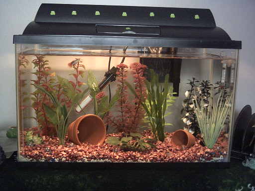 This is my new tank . You cant really see the guppies and tetras as they are very small still. Also they swim to fast for my camera to get a good pic. And no my tank is not titleed my camera was.