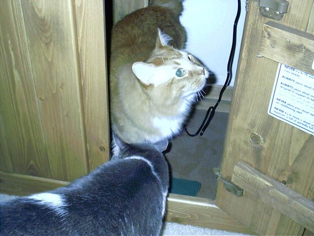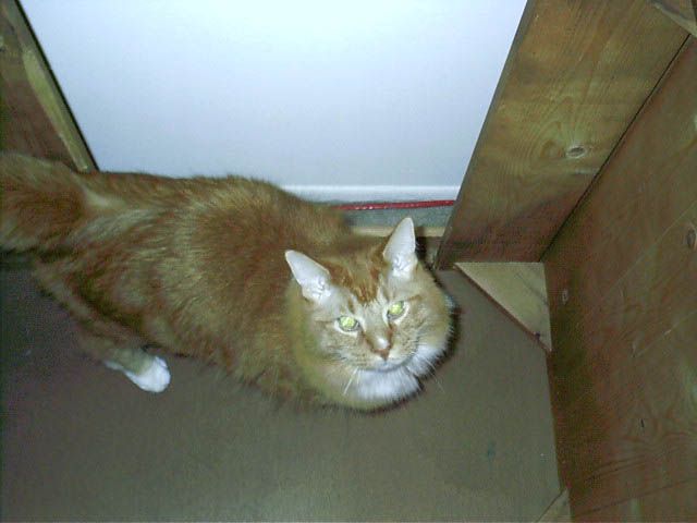 So, I go down to plug in the filters and guess who's back to re-inspect the stand. You got it. Fluffy - and this time, he's brought company.