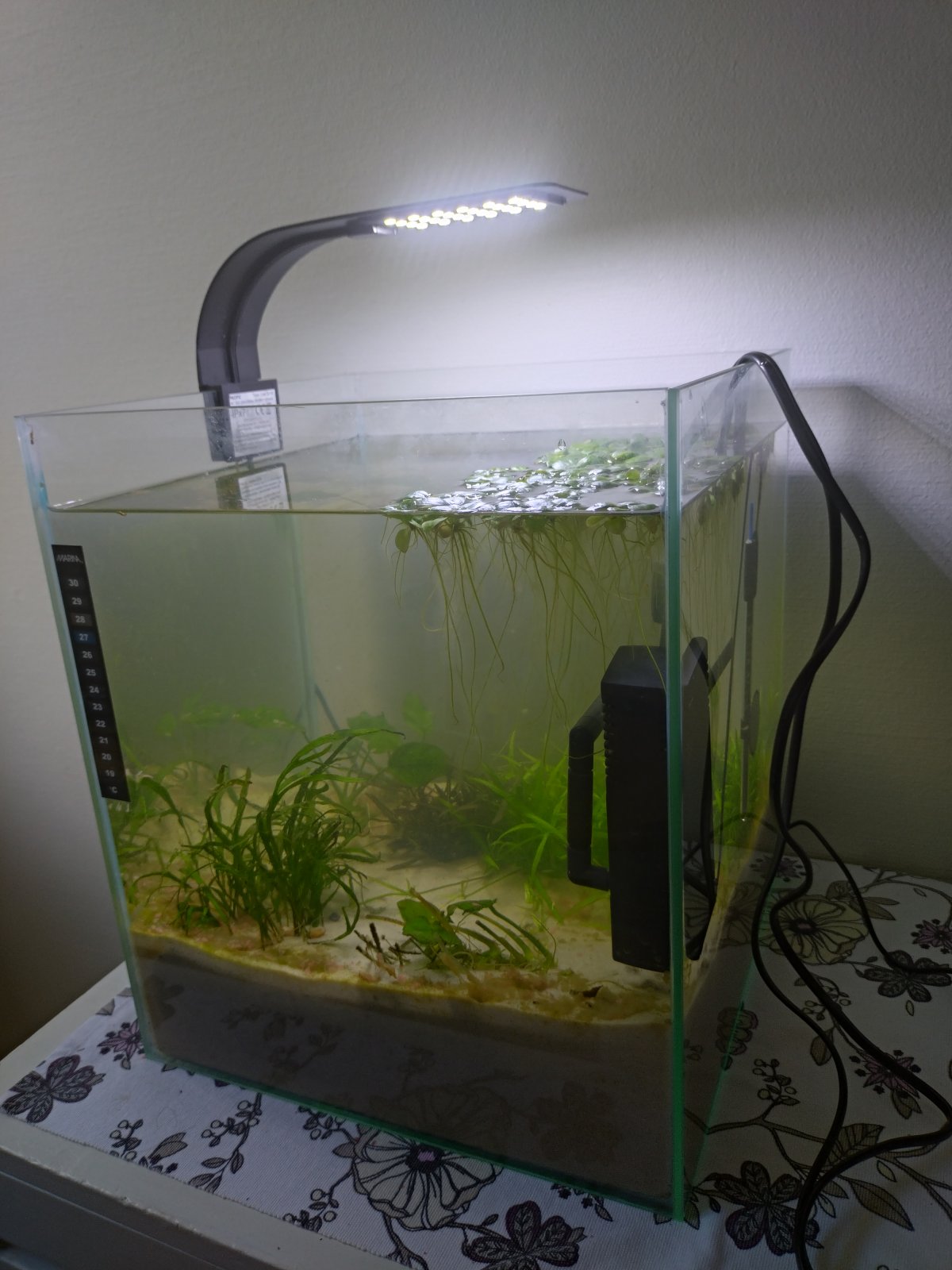 So this is my 8 gallon aquarium that I setup about 2 weeks ago and I have let it cycle since then and I have also started to notice that my plant to the right that I forgot the name off is growing and spreading in several different directions with some bigger or smaller than others. Test results show zero nitrates and also zero nitrites on the test strips for some reason which is not surprising given that likely the plants have been absorbing the nitrates in the tank especially the bright green spiky plant possibly indicating that the tank may soon be ready for a betta fish if not in a few more weeks of waiting.
