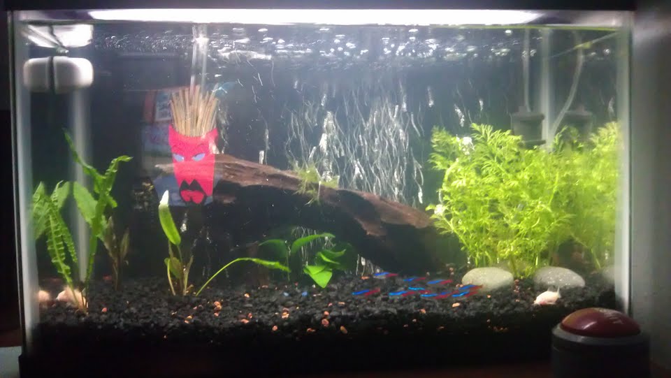 The plants in the right are water sprites i like them they look like little bushes. hidden under the wood is an anubis plant . attached to the wood is a piece of java moss waiting for it to attach. i have some cryptos and a strange plant that im not sure in on the left hand side. 7 neons 5 shrimp 3 corys and 1 betta reside there now