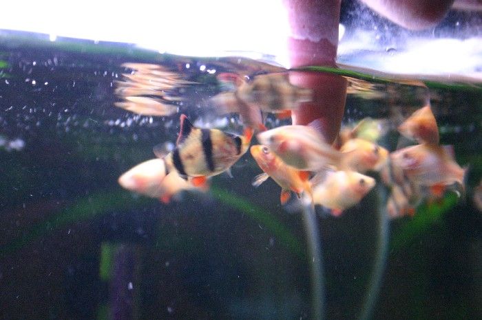 The Barbs. i was trying to distract the barbs , so i could take pictures of the other fish, but them wanting all the attention i put my finger in the tank to distract them lol