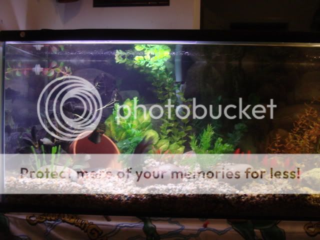 It's a 60 gallon running a Filstar XP1 - which I didn't realise was rated for a 45g tank, oh well..it'll work; . I had it sitting around doing nothing, I can't afford anything else. Anyways..I had the filter, gravel, rocks, and fake plants...the stand and tank was like a godsend! I was about to get rid of my fish cos it wasnt fair to keep them in a 20g tank like they were. it was just too small!