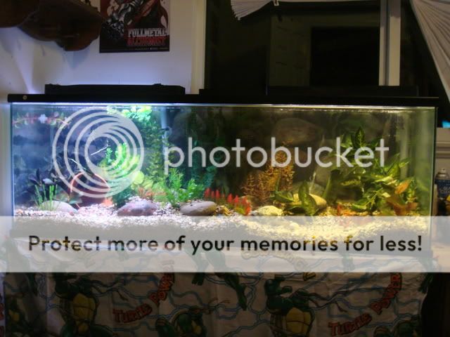 oh if you wonder why there's 2 shades of lighting...it's temporary...i used whatever i could find laying around for lights, i need to get a proper hood. The Ninja Turtles thing isn't permanent either hehe...that's just to cover the stuff on the shelf.