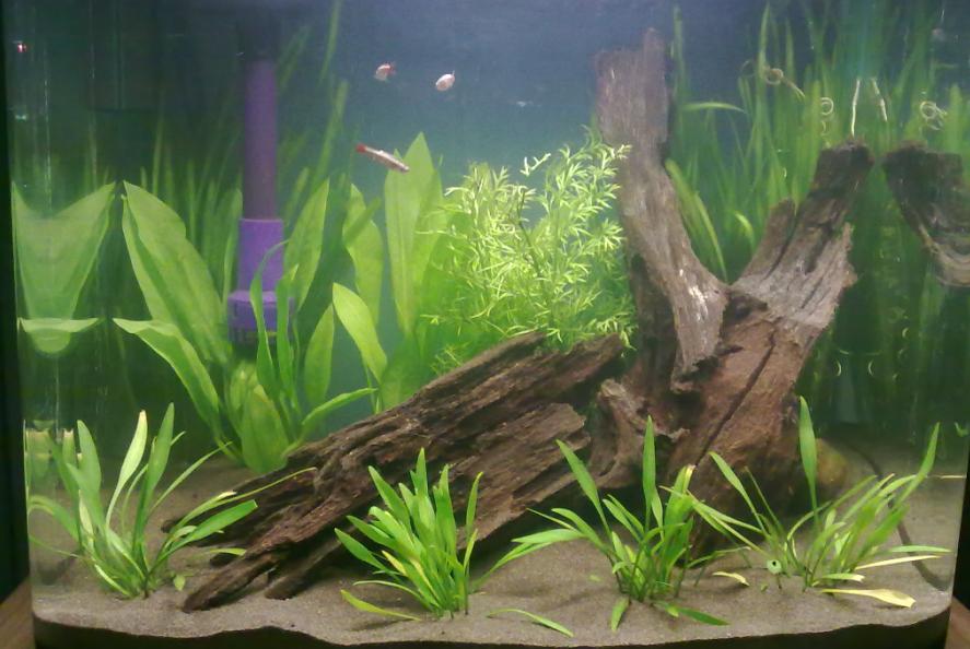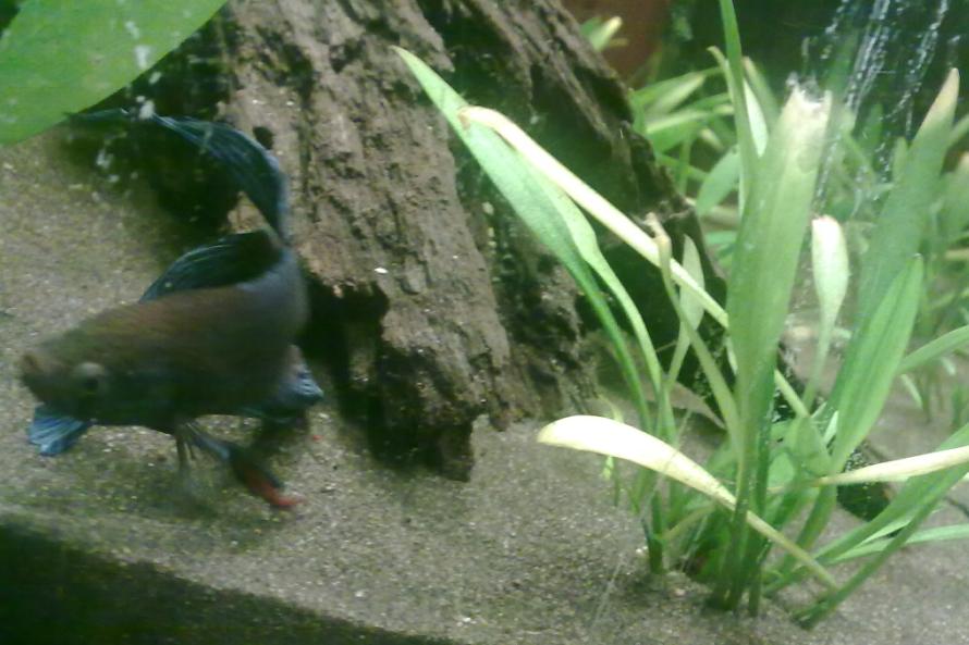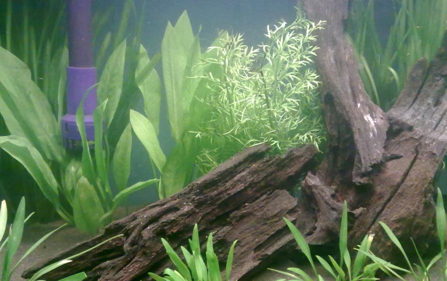 the tank contains black sand, driftwood and anubas and vallis. not sure on what the plants at the front or the bushy one is.