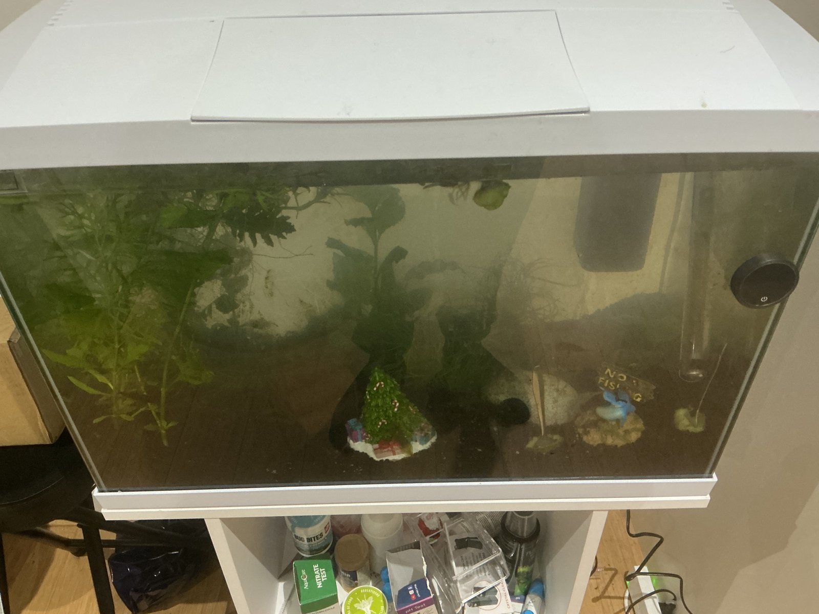 The veg were added last night. Light on.Looks a little to me. Is that with the light on? When did you add the veg on forks? They will be adding to the bioload if they've been in there a while. I would also scrape the front glass to make sure it's not just the algae making the tank look misty. Maybe even a water change.