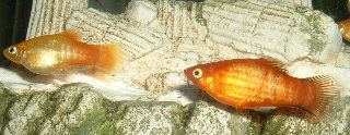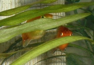 Here's my orange platy Sundance playing hide and seek with Red Cherry, my male platy/swordtail cross!