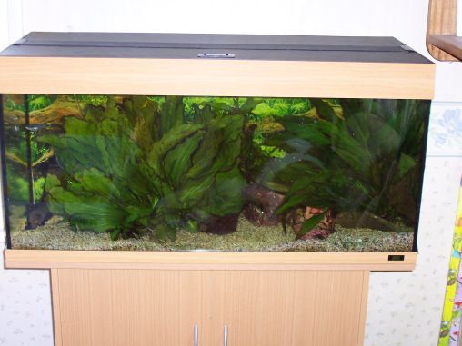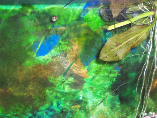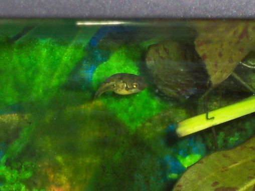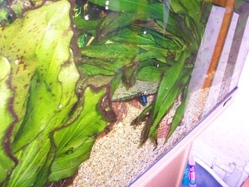 The tank is heavily planted and you can just see a bright blue cichlid with his nose poking out. I thought he was a peacock but not so sure now. His female is mouthbrooding.