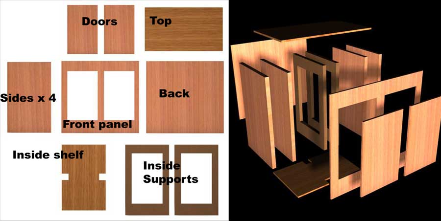 I made it using 3d studio max, and you can build it to any specs you have, I plan on using 3/4 inch plywood on the sides and inside posts, then on everything else MDF painted with clear coat to seal it. I don't personally like the wood textures much, I just did it so every one could tell what is what.