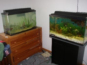 I love my two tanks! I'm getting some baby pink convicts tomarow for only 25 cents each and im getting them bright and early! Anyway heres a pic. of both tanks! The cich. tank is still a wee bit cloudy from 2 days ago at night on Thursday. I got some anarchae i think thats what their called. .99 for one bundle of 5! I got two bundles and omg! they got crazy little runners all over them