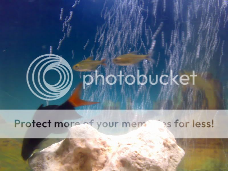 It looks good, but that rock doesn't. Is that a piece of iron shore or coral in the tank? Most rocks found in a marine environment will be made up of dead corals/organisms and will eventually give off Calcium into the water which isn't good. It can be used for some stuff I think it hardens the water but shouldn't be used noramally unless you have very soft water. If you would like to test the rock to see if it's okay you can put a few drops of vinegar onto the surface, if it bubbles then it shouldn't be placed back into the aquarium.