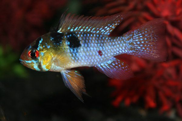 You need to feed more often with a better variety of food, I would take him back, Blue rams should be kept in waters with a temperature of 28-32oC with a PH of 5-6.6 and a GH of 0-12, fail to meet these and they won't last two seconds.