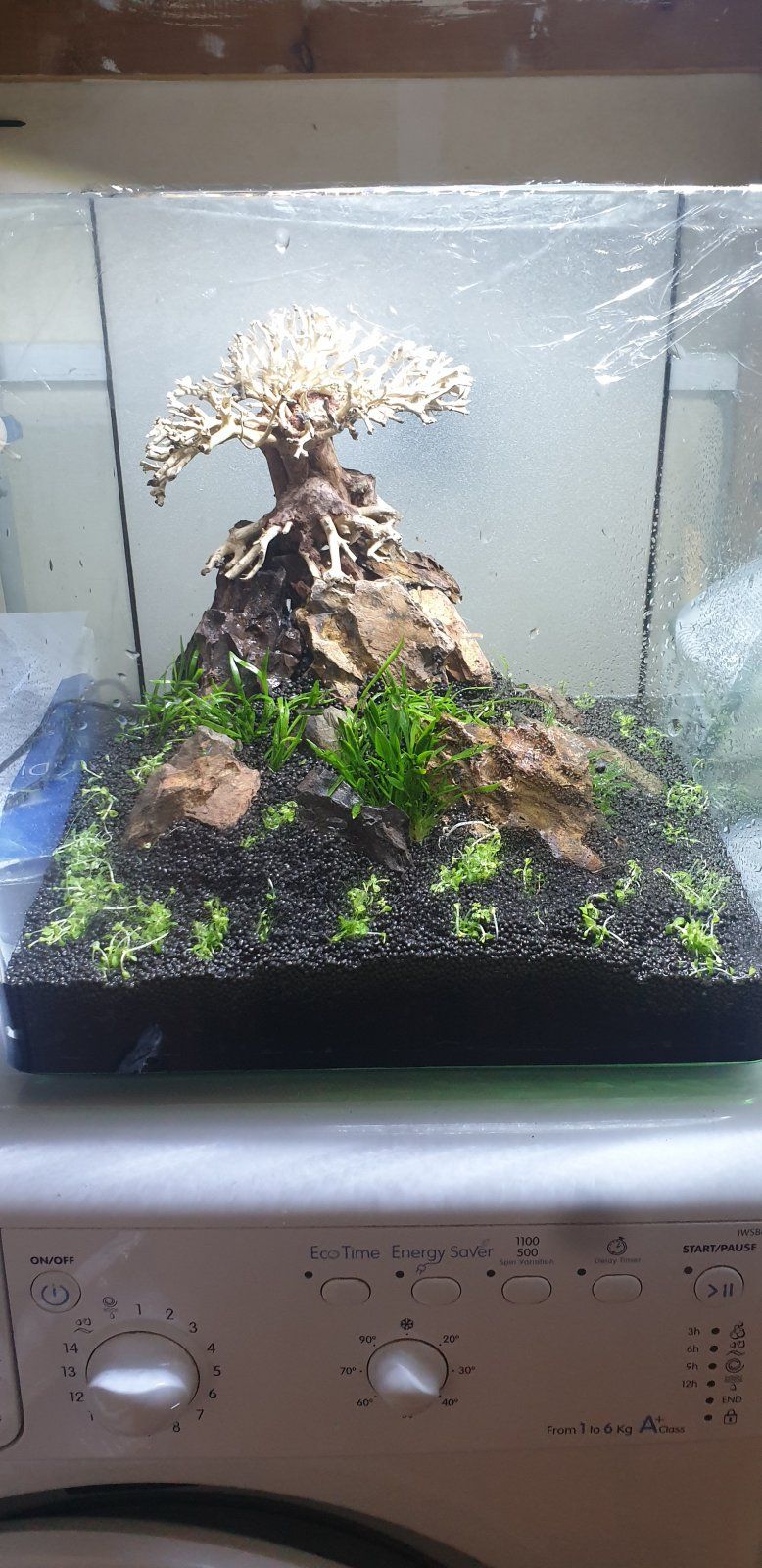 I really wish I had more disposable income to throw at aquascaping, it can get super expensive when you go all out. I did find a piece of driftwood that was sorta tree shaped once, glued some filter sponge pieces to the 'branches' and glued java moss to those to make a tree, and it worked pretty well! Was really pleased with it. But it's been in the 57 gallon for a long time and the moss is all full of hair algae that is impossible to remove, so might have to strip it down and start over once the algae is under control again.