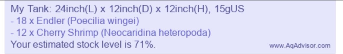 I think I’ve read that a rule of thumb is 1cm of fish to 1 ltr of water (but as always there are lots of exceptions ...). On that basis, if an Endler is about 1 inch (2.5 cms) I could have 21...and guppy’s @ 3.5 cms 15.