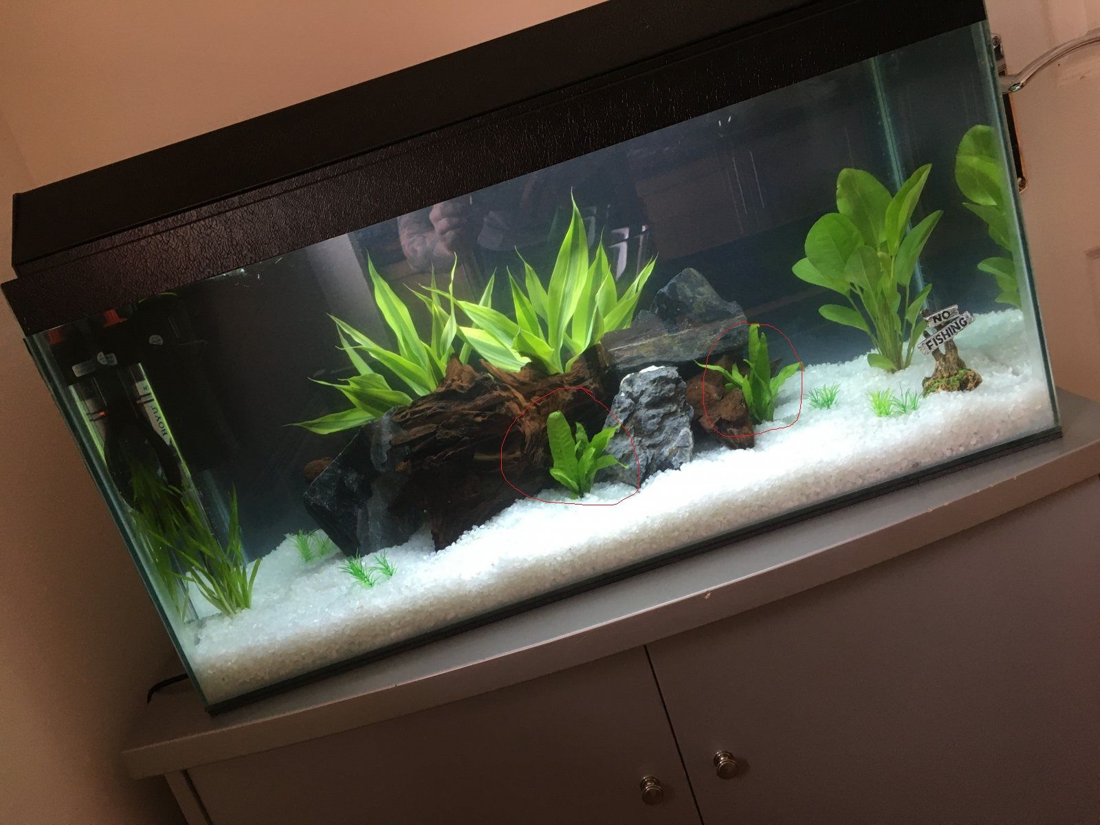 I concur with essjay in post #2. As for the houseplant, it is probably Dracaena variegata which is a yellow-striped variety, similar to the white-strip D. sanderiana. It is true that this terrestrial plant can live submersed for a few months, but it may suddenly begin to melt/decompose, and can be quite a mess biologically as well as visually, so be careful. If this were me, I would find a true aquatic to replace it before that happens.